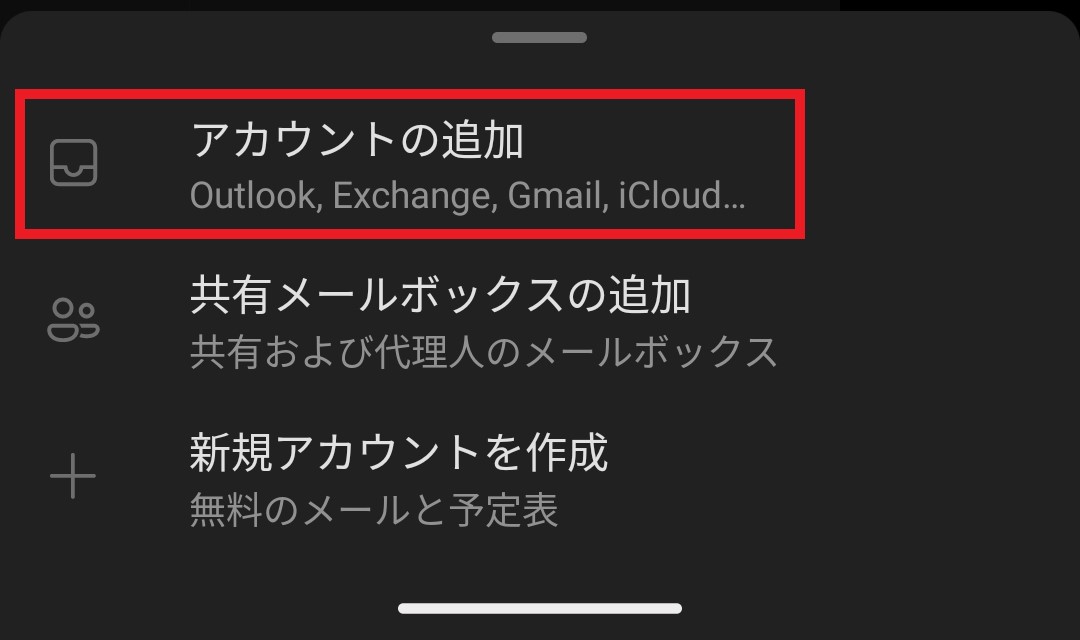画面下部に選択項目が表示されますので、「メールアカウントの追加」をクリックします。