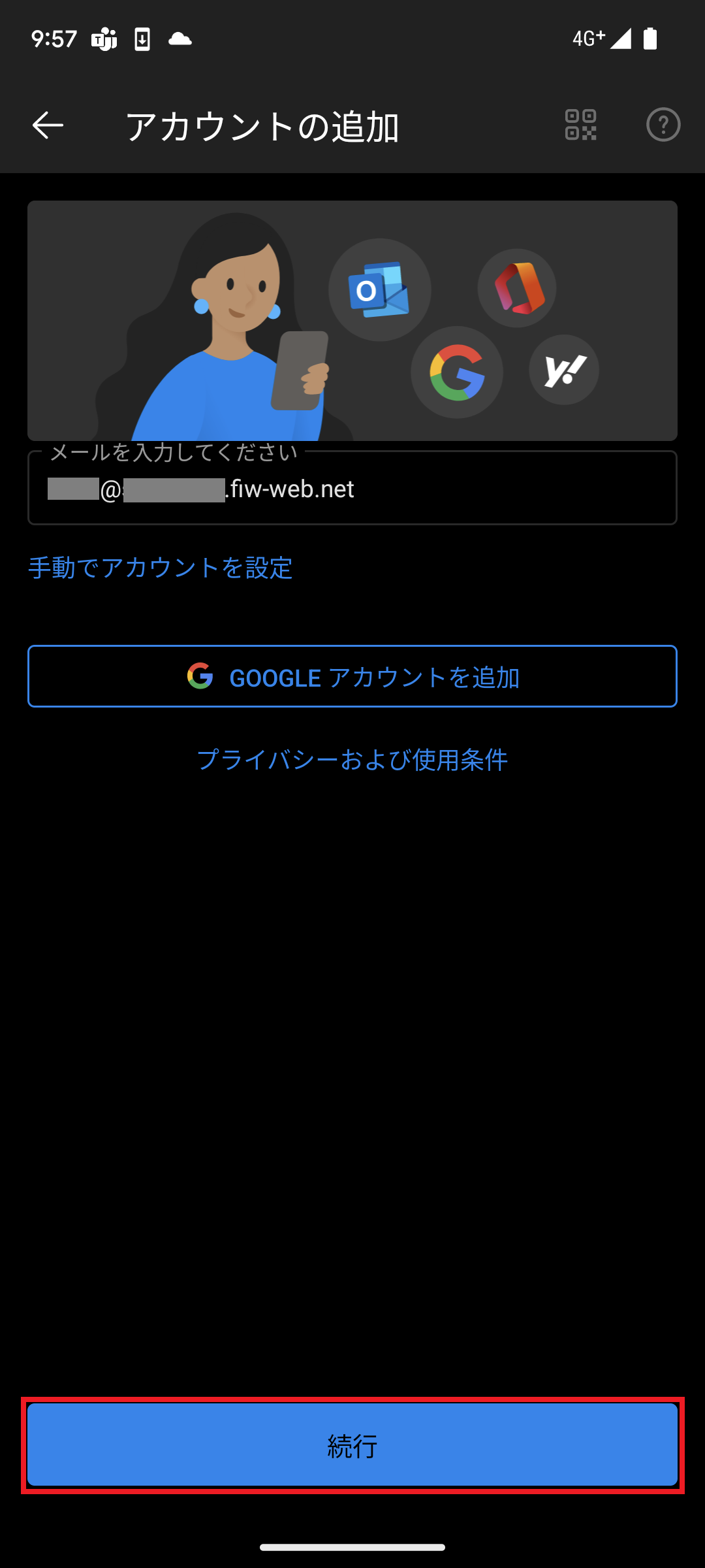 【Outlookアプリをインストールしてはじめての設定の場合(1つもメール設定が無い場合)】