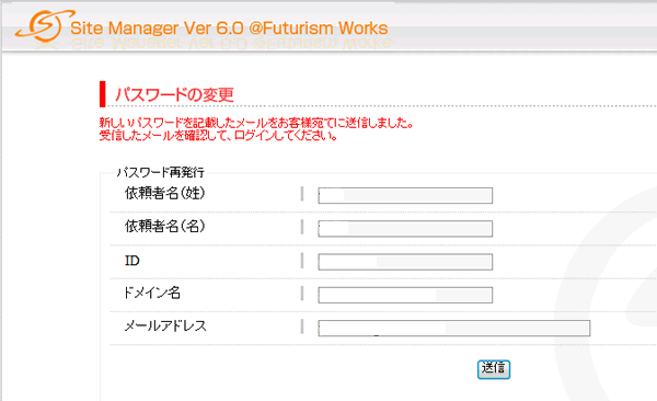 FTPパスワードを紛失された場合は、Site Managerログイン画面にて再発行が可能です。