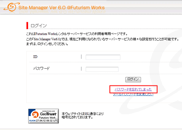 1. Site Managerログイン画面の[パスワードを忘れてしまった]をクリック。