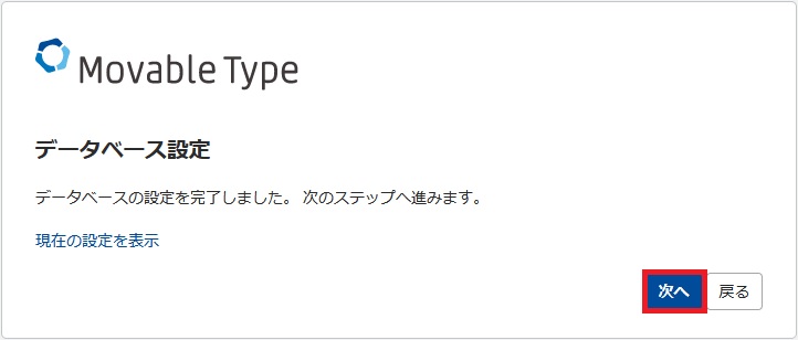 データベースの設定に間違いが無ければ、「データベースの設定を完了しました」と画面に表示されます。