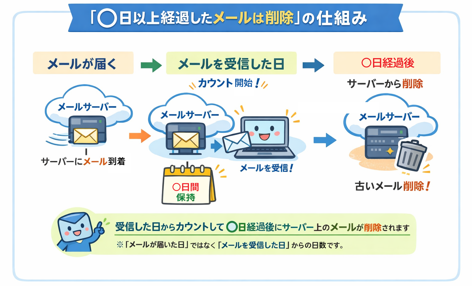 ご使用のメールソフトで、「○日後にサーバー上のメールを削除する」設定を行った場合、 メールサーバーにメールが届いた日からのカウントではなく、 ご使用のメールソフトでメールを受信した日から○日後にサーバー上のメール削除が行われます。