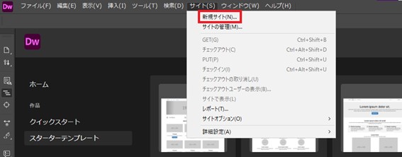 Dreamweaverを起動し、画面上部のタブから 「サイト(S) > 新規サイト(N)」 をクリックしてください。