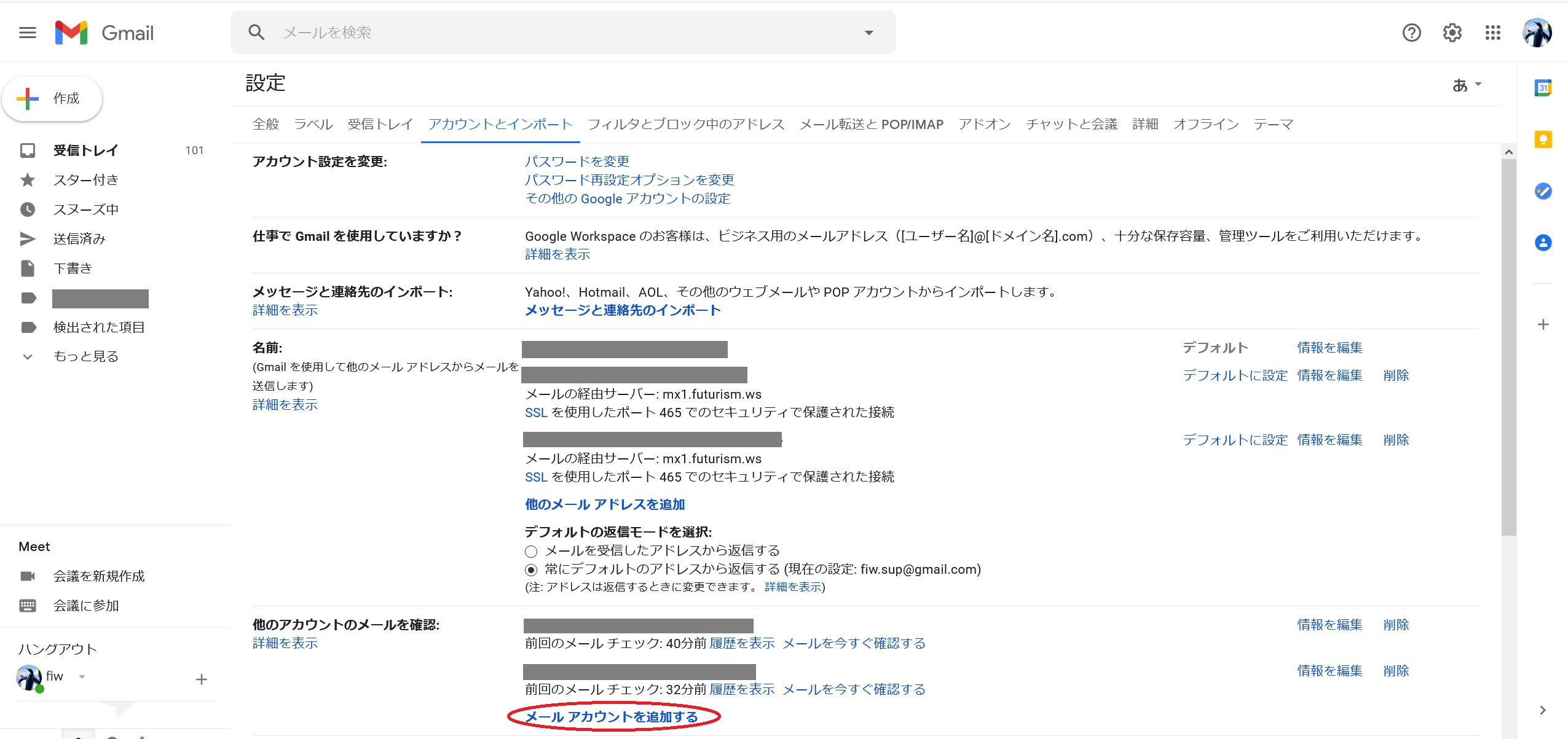 Gmail アカウント (*****@gmail.com) から xxxxx@test.fiw.net