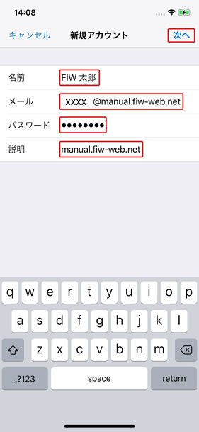 もし、認証が上手くいかない場合、もしくはメールが送信エラーになってしまう場合は、次項の6へお進み下さい。| ホスト名 | お客様のPOP3サーバー名 (例:manual.fiw-web.net、mail.manual.fiw-web.net) |