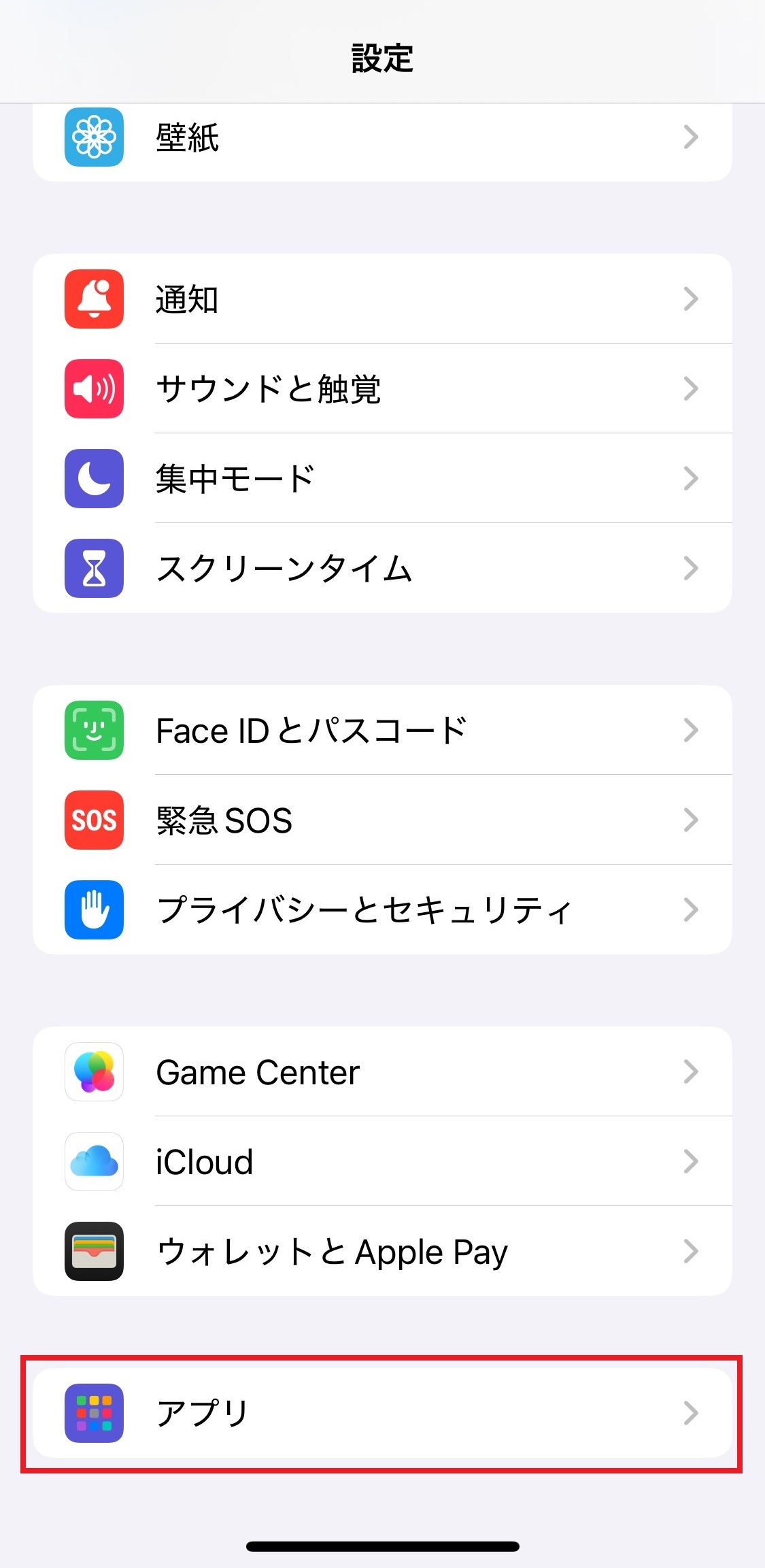 設定の画面が表示されましたら、画面の下方向にスワイプして「アプリ」をタップします。