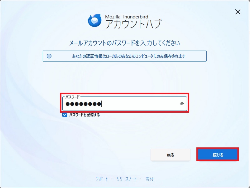 SiteManagerで設定したメールパスワードを入力し、[ 続ける ]をクリックします。