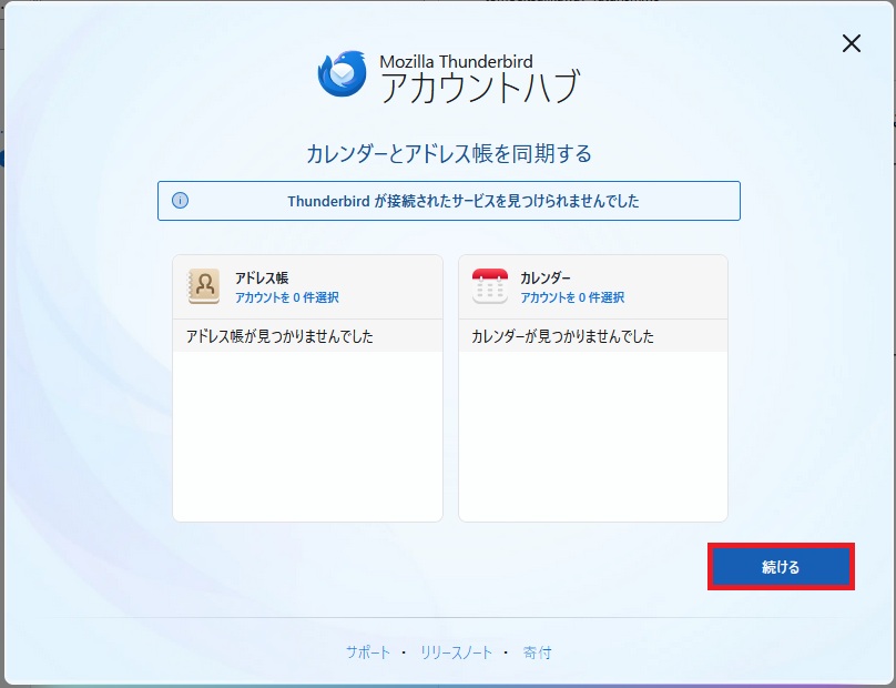 カレンダーやアドレス帳の同期画面が表示されます。任意の設定を行い、[続ける]ボタンをクリックします。