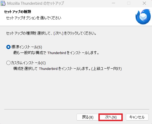 セットアップの小ウィンドウが表示されるので、[次へ]をクリックします。