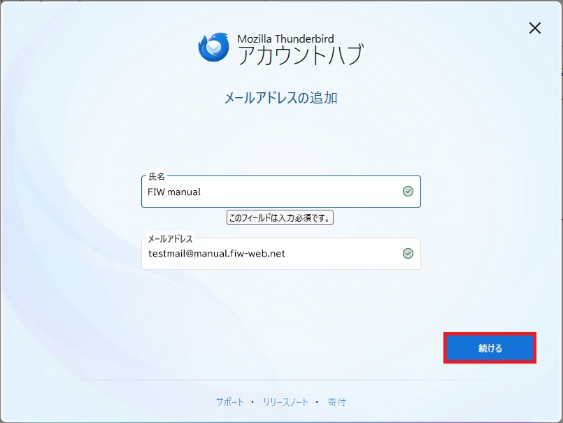 | 氏名 | 送信相手に表示される名前を入力 (例:FIW 太郎) |