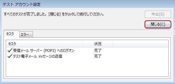 アカウント設定のテストが正常に終了した場合は、下記の様に受信、送信ともに完了となります。